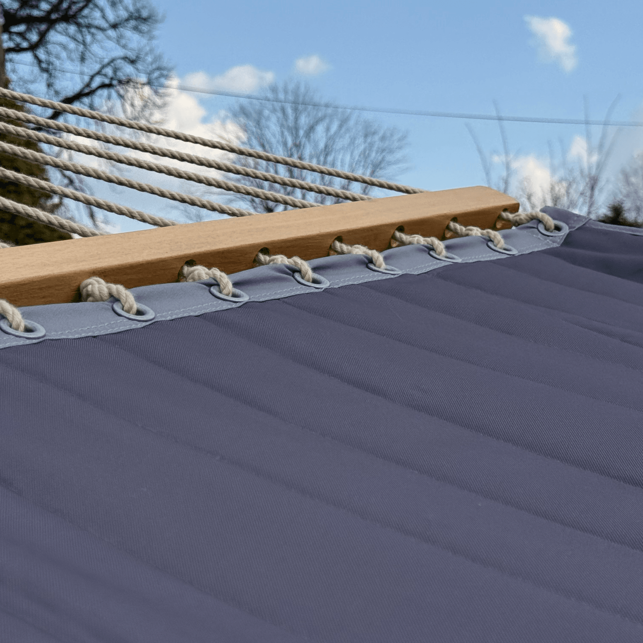 Hamak wykonany został z autorskiego materiału, przyjemnego w dotyku niczym bawełna.