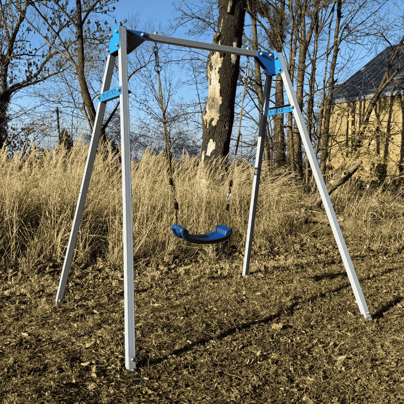 Solidna pojedyncza huśtawka ogrodowa wykonana z wytrzymałej stali ocynkowanej ogniowo, zapewniająca stabilność i komfort użytkowania.