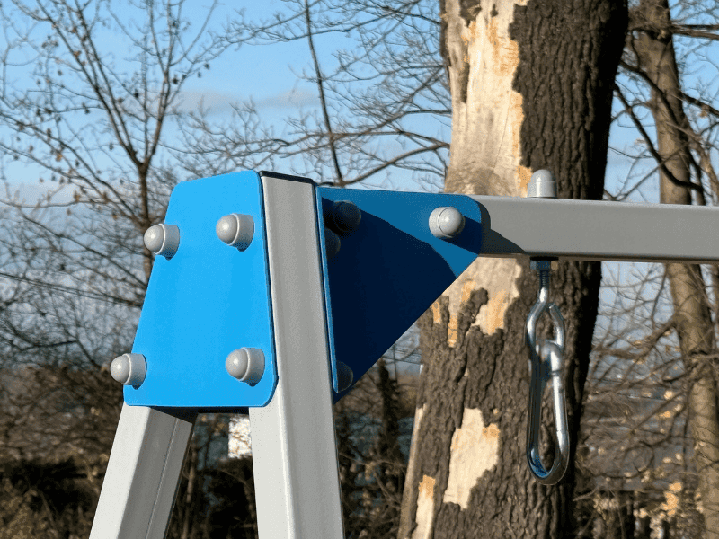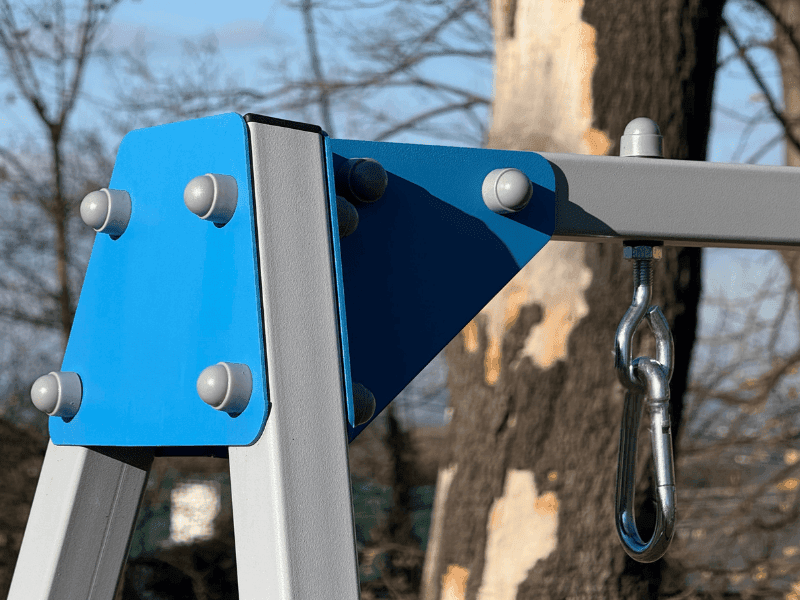 Górna belka jest wyposażona w dwa haki huśtawkowe zamknięte z karabińczykami, które zostały zabezpieczone nakrętkami samokontrującymi. Haki huśtawkowe z karabińczykami umożliwiają zawieszenie huśtawki bez potrzeby zakupu dodatkowych karabińczyków.