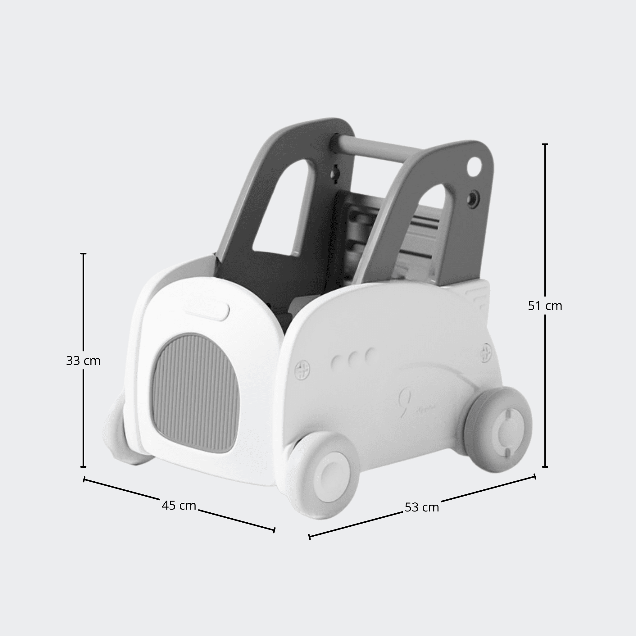 - Zabezpieczenie bagażu: Po złożeniu półka domyka wnętrze jeździka, chroniąc przewożone w środku zabawki przed wypadnięciem.