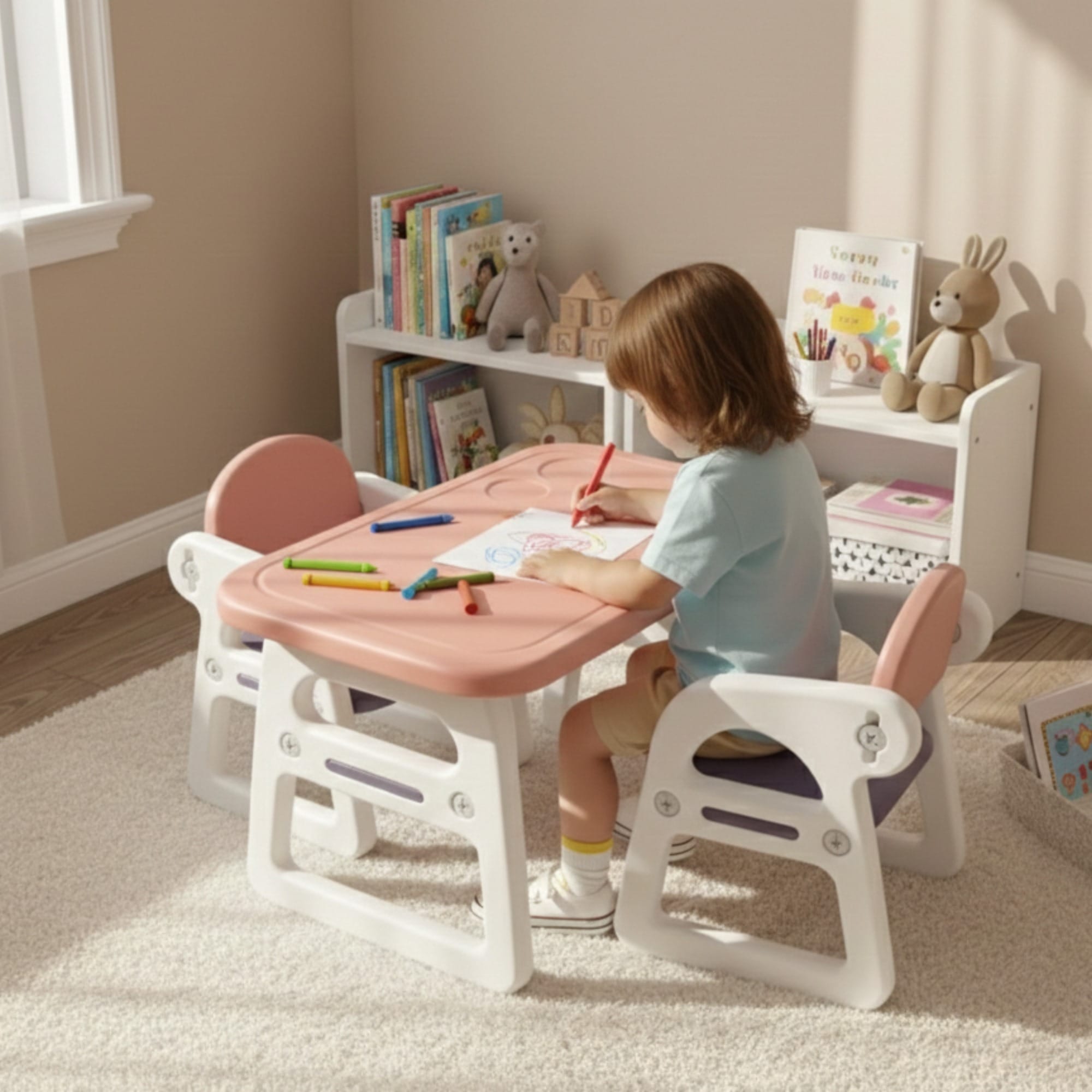 - Ergonomia: Wysokość stolika i krzesełek została zaprojektowana tak, aby wspierać prawidłową postawę dziecka podczas siedzenia.