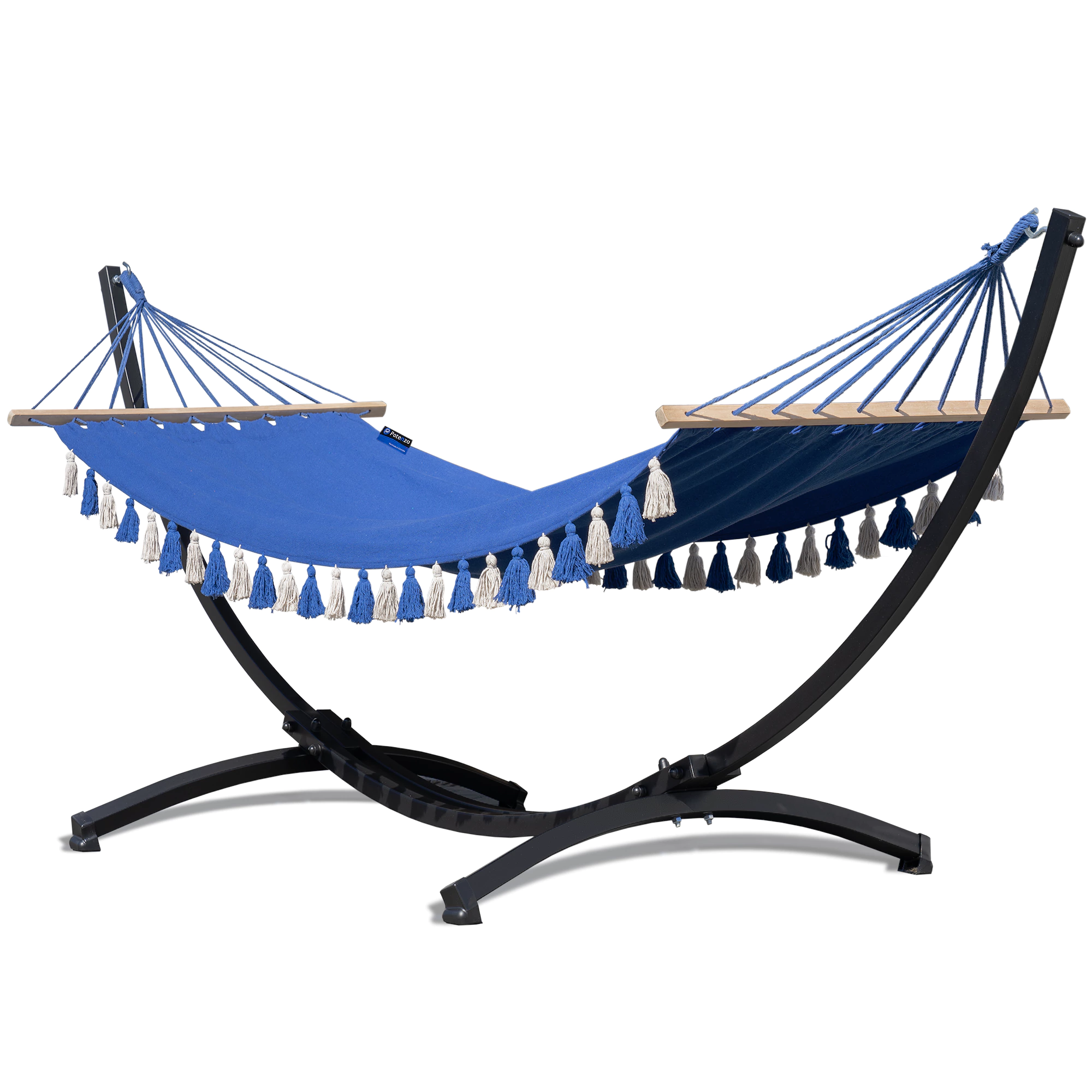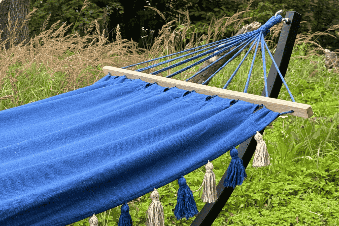 Stelaż do hamaka „300” do 200 kg + hamak z pomponami niebieski