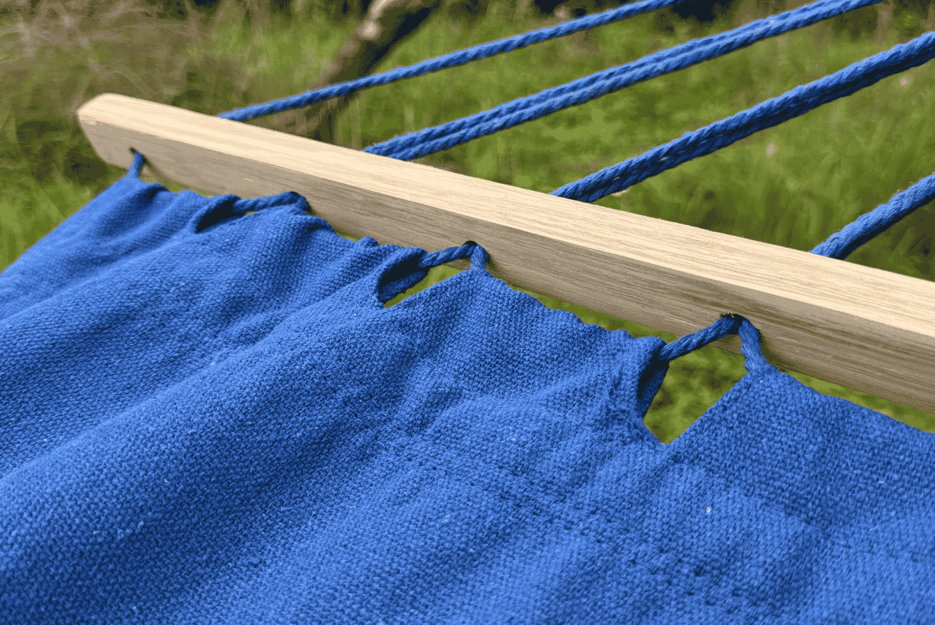 Dodatkowym elementem są drewniane poprzeczki na obu końcach materiału, które utrzymują jego rozłożoną formę.