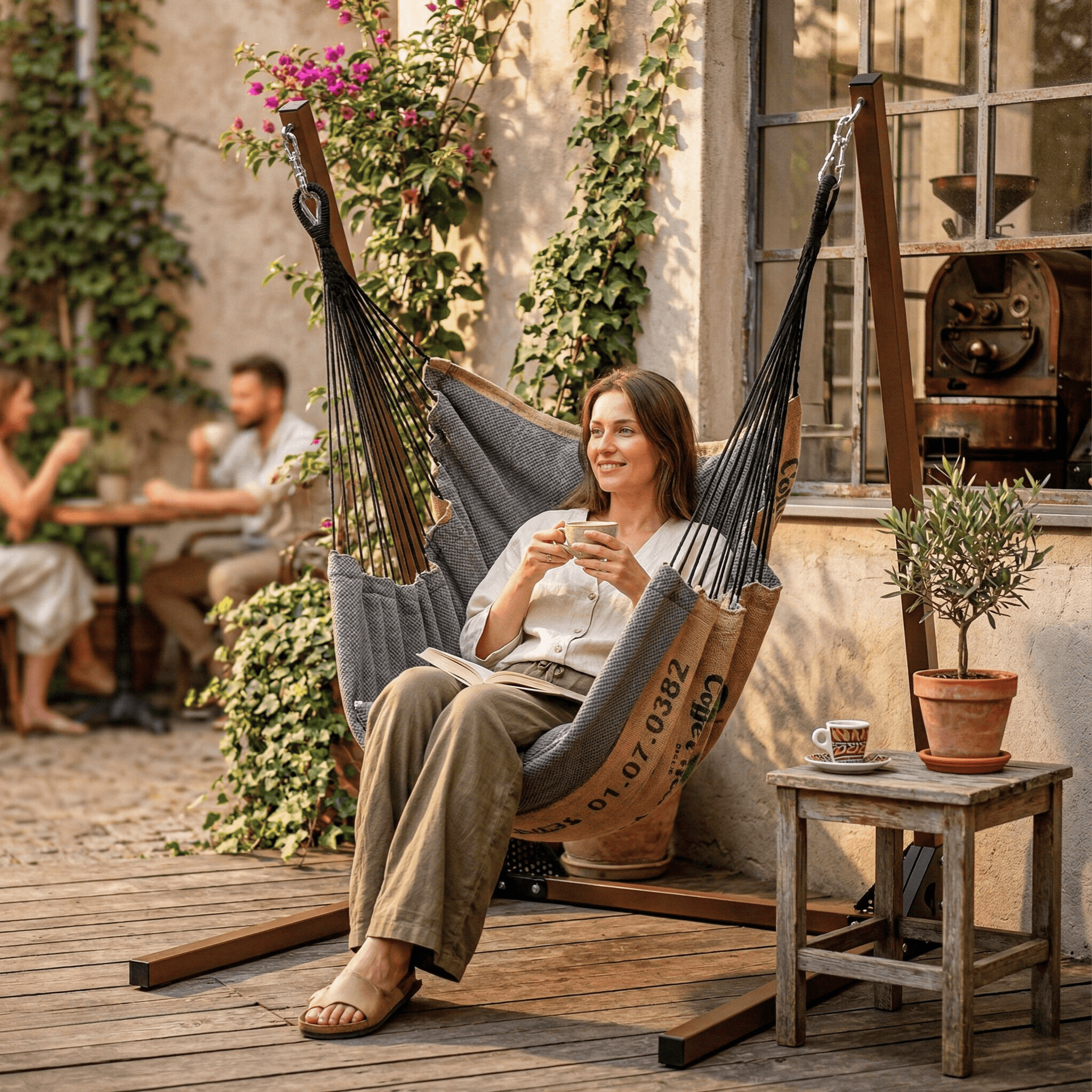 Ciesz się chwilami relaksu na wygodnym fotelu hamakowym lub wiszącym, zawieszonym na naszym solidnym i wyróżniającym się stojaku!